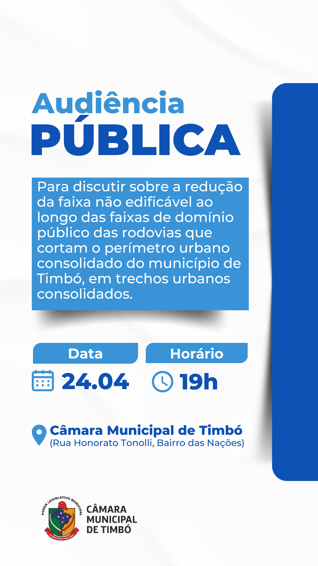 A Câmara de Vereadores de Timbó promove, nesta quinta-feira (24), uma audiência pública para discutir o Projeto de Lei Complementar nº 03/2025, que propõe a redução da faixa não edificável ao longo das rodovias que atravessam áreas urbanas consolidadas do município.