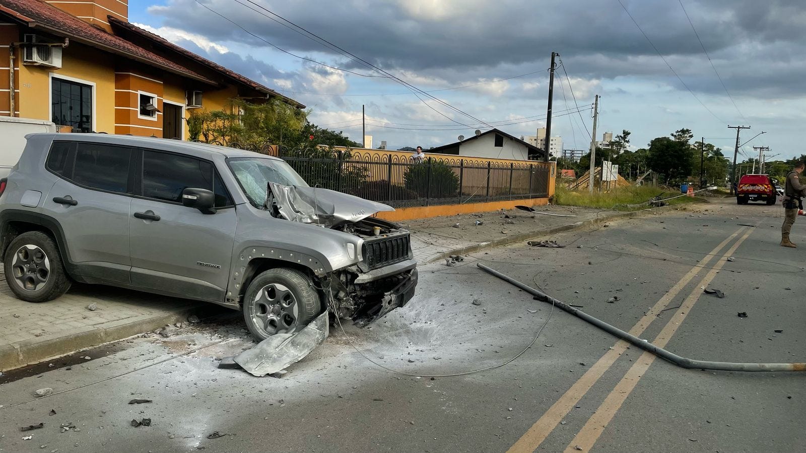 Na tarde deste sábado (22), por volta das 16h20, o Corpo de Bombeiros Militar de Timbó atendeu a uma ocorrência de acidente de trânsito na rua Marechal Deodoro da Fonseca, no bairro Nações. Um veículo Jeep Renegade colidiu contra um poste, derrubando fios de alta tensão e provocando um princípio de incêndio.