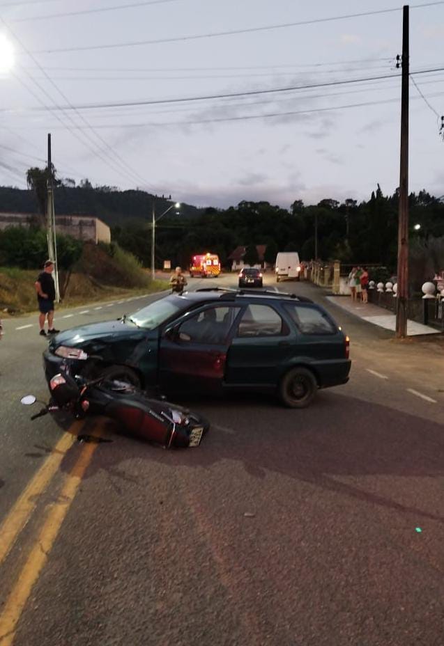 Na noite deste domingo (12), por volta das 19h11, uma colisão envolvendo um carro e uma motocicleta foi registrada na rua Celso Ramos, em Benedito Novo.
