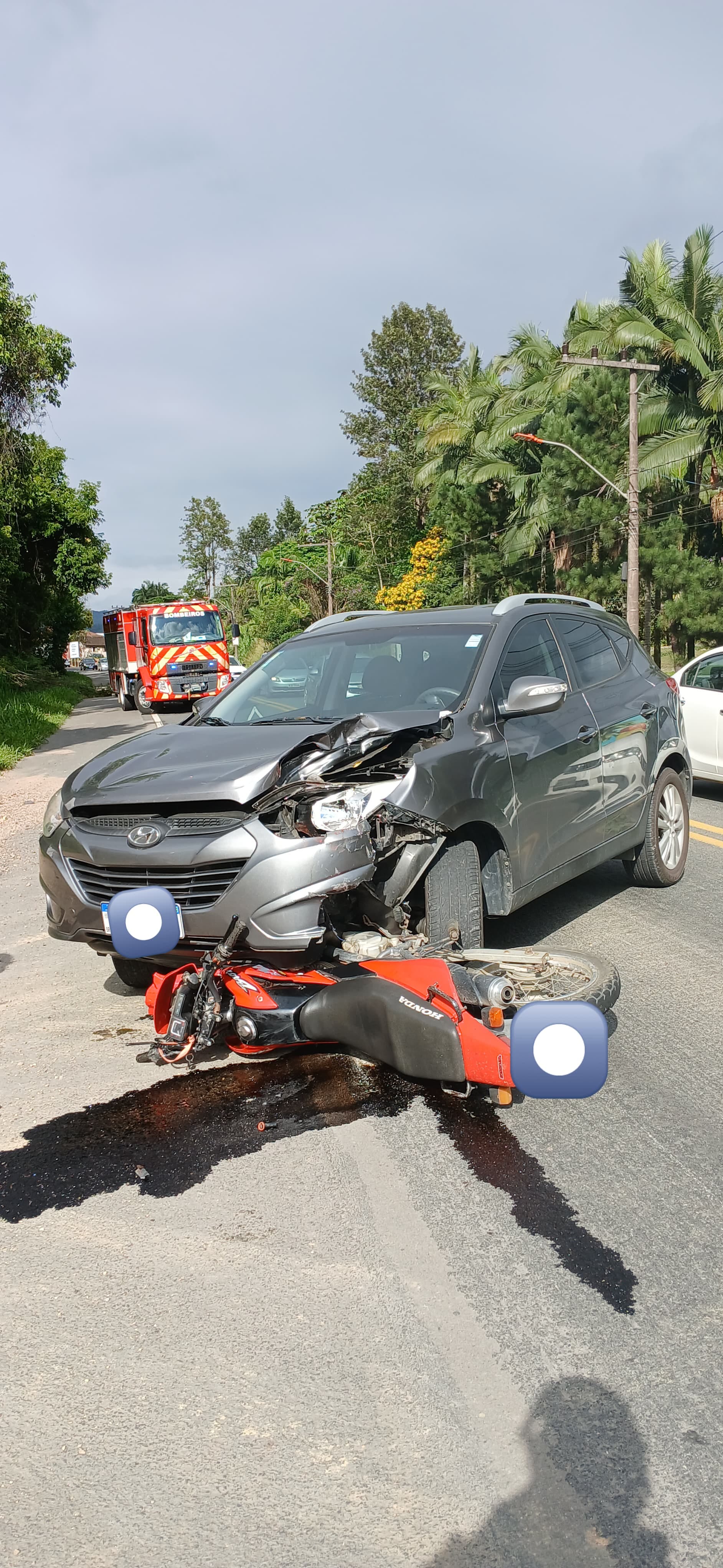 Na manhã deste sábado (22), um acidente de trânsito envolvendo um carro e uma motocicleta foi registrado no km 96 da BR-470, no bairro Posto Fiscal, em Apiúna.