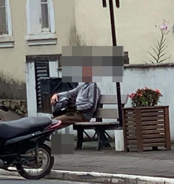 De acordo com o relato, o homem — de pele branca, estatura mediana, vestindo blusa cinza com listras pretas e calça marrom — utilizava uma motocicleta preta, modelo Honda Biz, estacionada próxima ao local onde cometeu o ato, em um banco na área central da cidade.