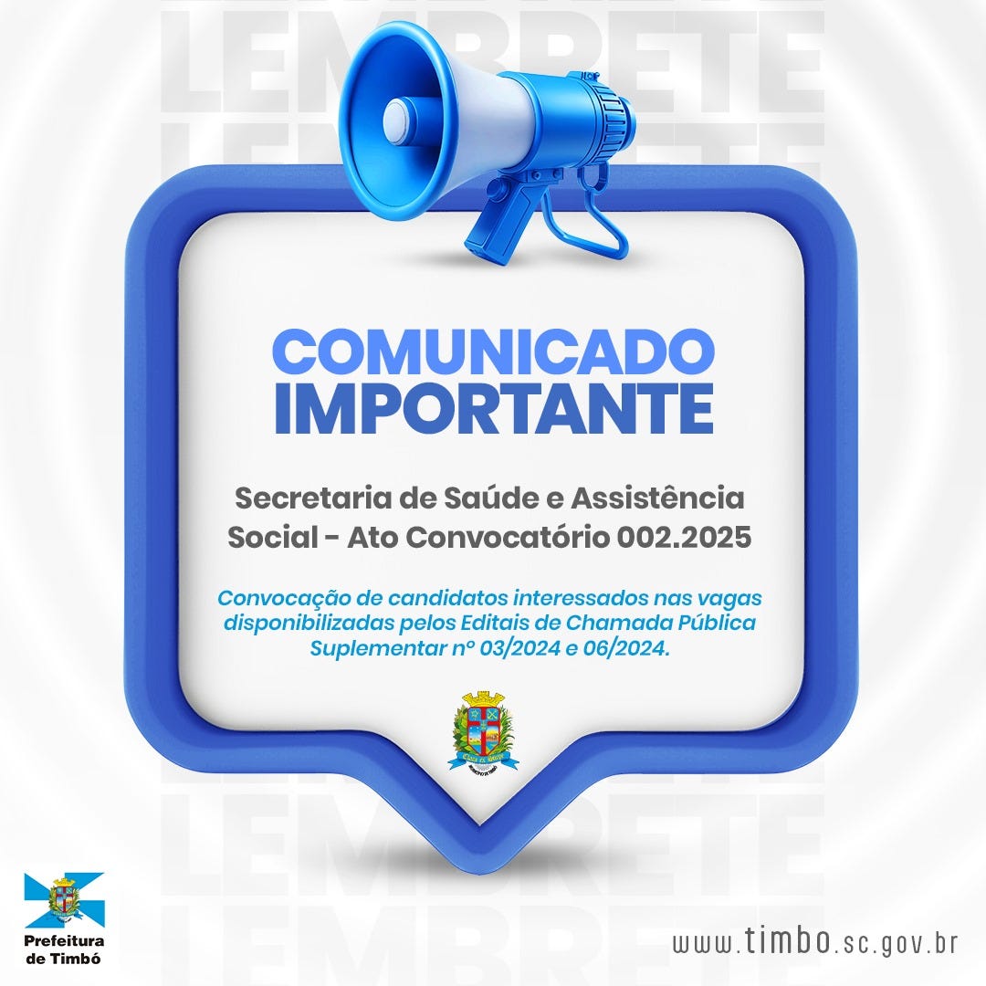 A Secretaria Municipal de Saúde e Assistência Social de Timbó, por meio da Comissão de Seleção de Pessoal, está convocando candidatos para vagas descritas nos Editais de Chamada Pública Suplementar nº 03/2024 e 06/2024, conforme o Ato Convocatório nº 002/2025.