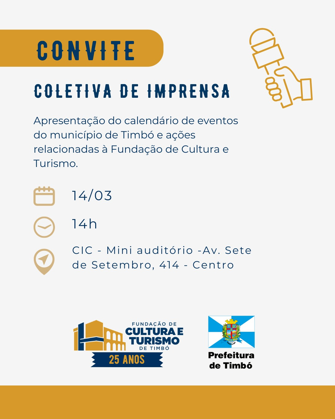 A Prefeitura de Timbó, por meio da Fundação de Cultura e Turismo (FCTT), realizará nesta sexta-feira (14) uma coletiva de imprensa para apresentar o calendário oficial de eventos do município para 2025. Além disso, a FCTT abordará novas ações previstas para este ano e fará um balanço das iniciativas já realizadas.